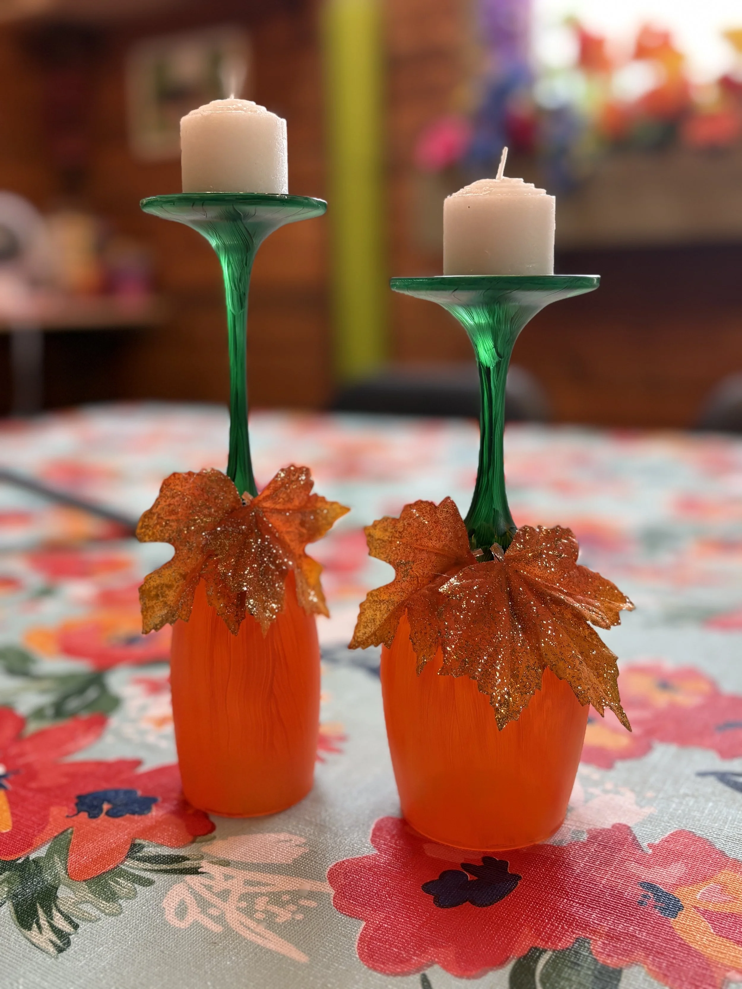 Wine glass pumpkin candle holders. Very simple, yet elegant fall home decor for your Thanksgiving table. Here’s how to make them.